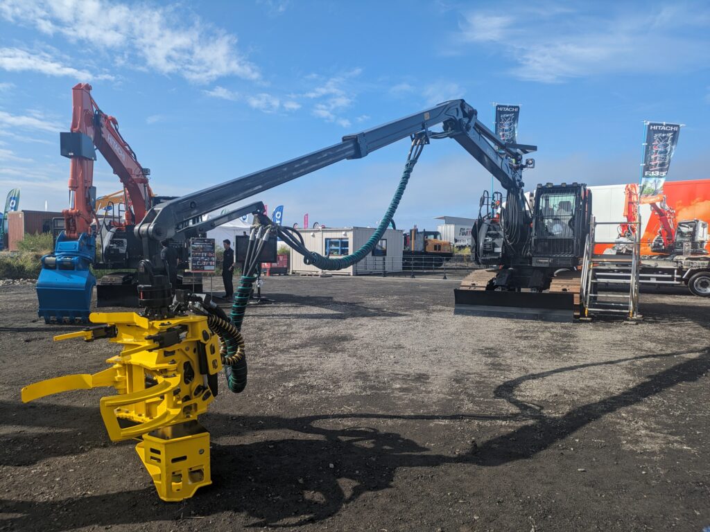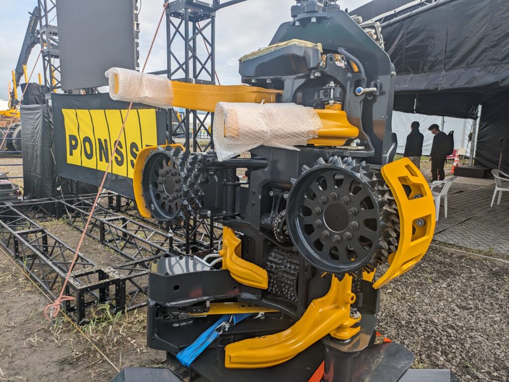 特に注目したのは、ロングリーチアーム搭載型。アーム構造は高張力鋼材を使用しており、軽量化と高剛性を両立。傾斜地や不整地での伐採作業を可能とする長尺アームは、作業半径の拡大によって、作業者が危険なエリアに立ち入ることなく遠隔から処理を行うことを実現していました。